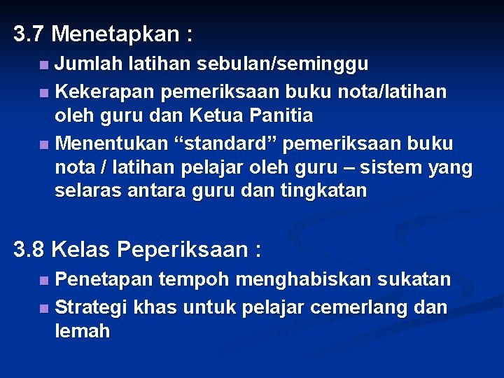 3. 7 Menetapkan : Jumlah latihan sebulan/seminggu n Kekerapan pemeriksaan buku nota/latihan oleh guru dan Ketua Panitia n Menentukan “standard” pemeriksaan buku nota / latihan pelajar oleh guru – sistem yang selaras antara guru dan tingkatan n 3. 8 Kelas Peperiksaan : Penetapan tempoh menghabiskan sukatan n Strategi khas untuk pelajar cemerlang dan lemah n