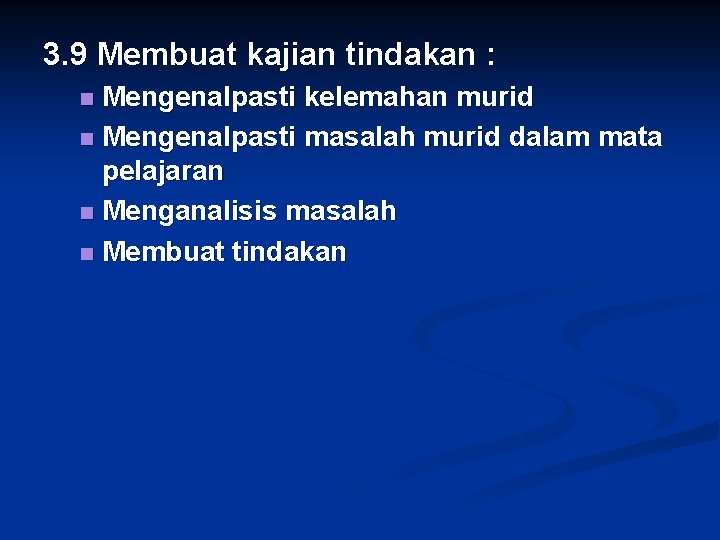 3. 9 Membuat kajian tindakan : Mengenalpasti kelemahan murid n Mengenalpasti masalah murid dalam mata pelajaran n Menganalisis masalah n Membuat tindakan n