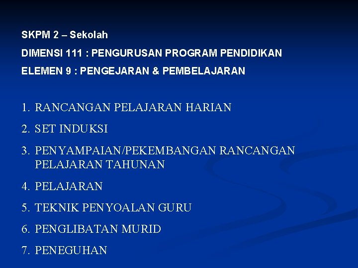 SKPM 2 – Sekolah DIMENSI 111 : PENGURUSAN PROGRAM PENDIDIKAN ELEMEN 9 : PENGEJARAN & PEMBELAJARAN 1. RANCANGAN PELAJARAN HARIAN 2. SET INDUKSI 3. PENYAMPAIAN/PEKEMBANGAN RANCANGAN PELAJARAN TAHUNAN 4. PELAJARAN 5. TEKNIK PENYOALAN GURU 6. PENGLIBATAN MURID 7. PENEGUHAN