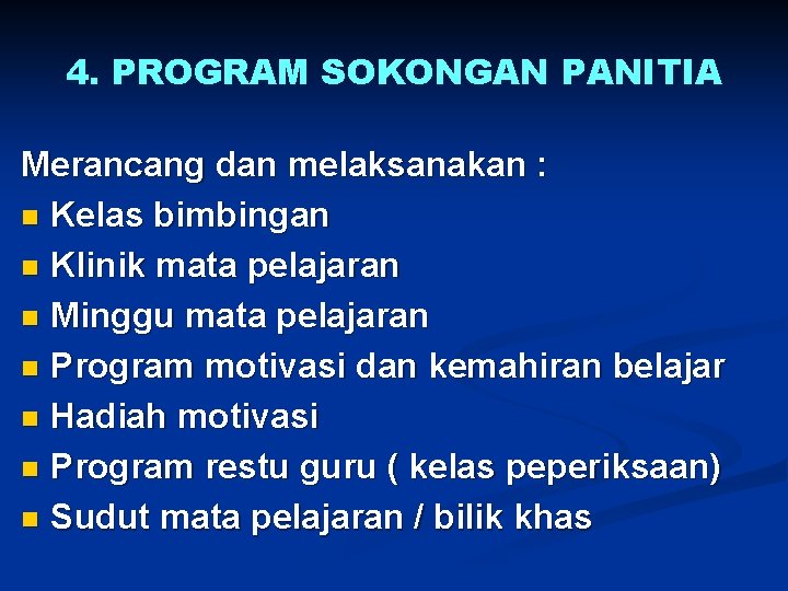 4. PROGRAM SOKONGAN PANITIA Merancang dan melaksanakan : n Kelas bimbingan n Klinik mata pelajaran n Minggu mata pelajaran n Program motivasi dan kemahiran belajar n Hadiah motivasi n Program restu guru ( kelas peperiksaan) n Sudut mata pelajaran / bilik khas