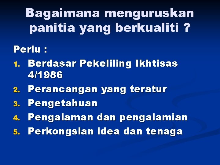 Bagaimana menguruskan panitia yang berkualiti ? Perlu : 1. Berdasar Pekeliling Ikhtisas 4/1986 2. Perancangan yang teratur 3. Pengetahuan 4. Pengalaman dan pengalamian 5. Perkongsian idea dan tenaga