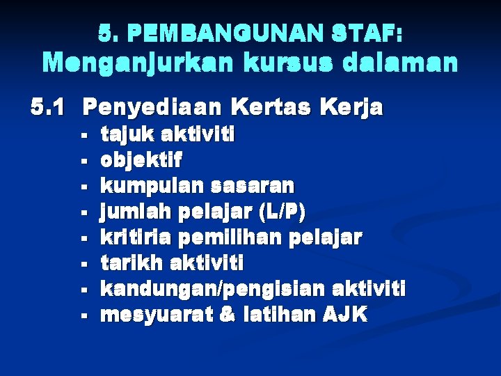 5. PEMBANGUNAN STAF: Menganjurkan kursus dalaman 5. 1 Penyediaan Kertas Kerja - tajuk aktiviti objektif kumpulan sasaran jumlah pelajar (L/P) kritiria pemilihan pelajar tarikh aktiviti kandungan/pengisian aktiviti mesyuarat & latihan AJK