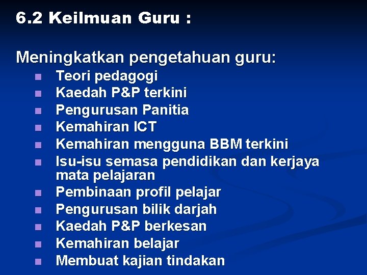 6. 2 Keilmuan Guru : Meningkatkan pengetahuan guru: n n n Teori pedagogi Kaedah P&P terkini Pengurusan Panitia Kemahiran ICT Kemahiran mengguna BBM terkini Isu-isu semasa pendidikan dan kerjaya mata pelajaran Pembinaan profil pelajar Pengurusan bilik darjah Kaedah P&P berkesan Kemahiran belajar Membuat kajian tindakan