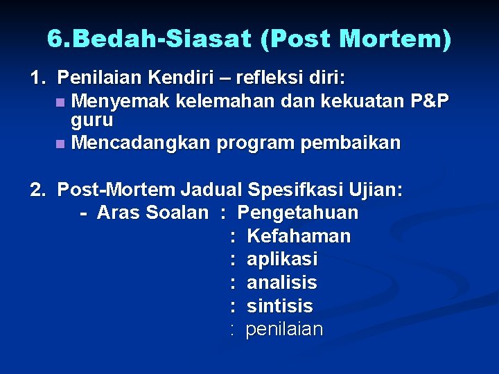 6. Bedah-Siasat (Post Mortem) 1. Penilaian Kendiri – refleksi diri: n Menyemak kelemahan dan kekuatan P&P guru n Mencadangkan program pembaikan 2. Post-Mortem Jadual Spesifkasi Ujian: - Aras Soalan : Pengetahuan : Kefahaman : aplikasi : analisis : sintisis : penilaian