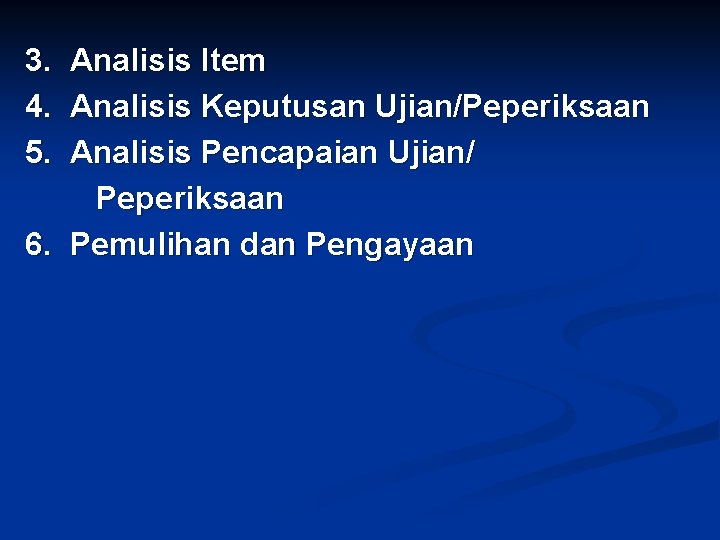3. 4. 5. Analisis Item Analisis Keputusan Ujian/Peperiksaan Analisis Pencapaian Ujian/ Peperiksaan 6. Pemulihan dan Pengayaan