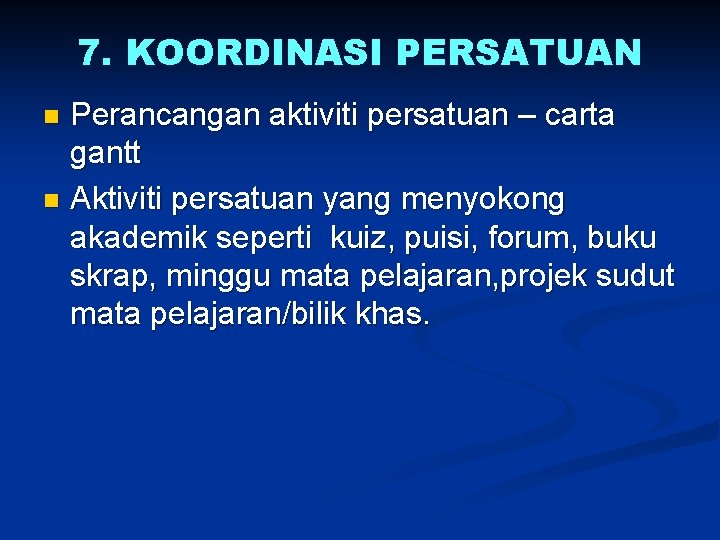 7. KOORDINASI PERSATUAN Perancangan aktiviti persatuan – carta gantt n Aktiviti persatuan yang menyokong akademik seperti kuiz, puisi, forum, buku skrap, minggu mata pelajaran, projek sudut mata pelajaran/bilik khas. n