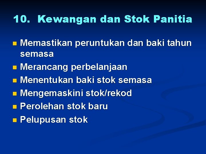 10. Kewangan dan Stok Panitia Memastikan peruntukan dan baki tahun semasa n Merancang perbelanjaan n Menentukan baki stok semasa n Mengemaskini stok/rekod n Perolehan stok baru n Pelupusan stok n