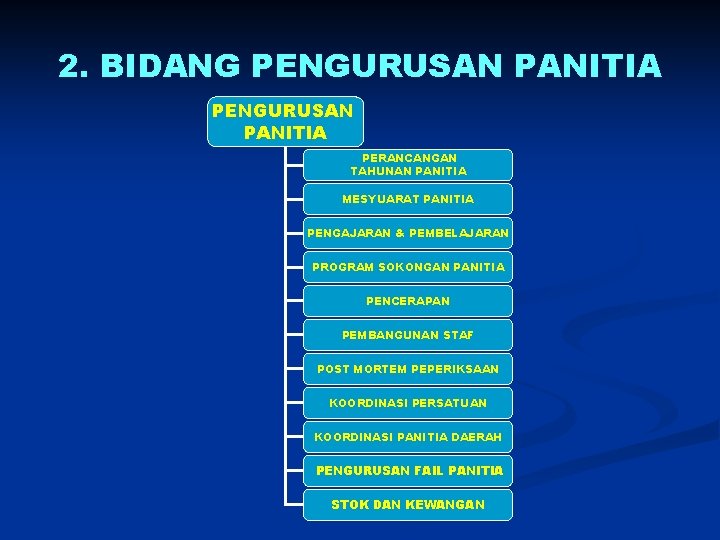 2. BIDANG PENGURUSAN PANITIA PERANCANGAN TAHUNAN PANITIA MESYUARAT PANITIA PENGAJARAN & PEMBELAJARAN PROGRAM SOKONGAN PANITIA PENCERAPAN PEMBANGUNAN STAF POST MORTEM PEPERIKSAAN KOORDINASI PERSATUAN KOORDINASI PANITIA DAERAH PENGURUSAN FAIL PANITIA STOK DAN KEWANGAN