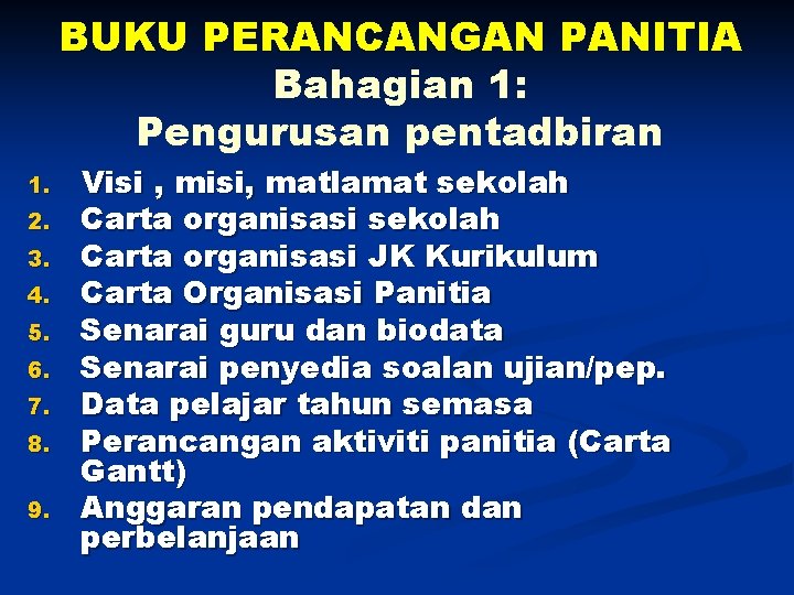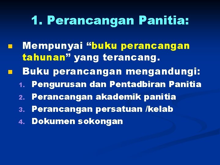 1. Perancangan Panitia: n n Mempunyai “buku perancangan tahunan” yang terancang. Buku perancangan mengandungi: 1. 2. 3. 4. Pengurusan dan Pentadbiran Panitia Perancangan akademik panitia Perancangan persatuan /kelab Dokumen sokongan