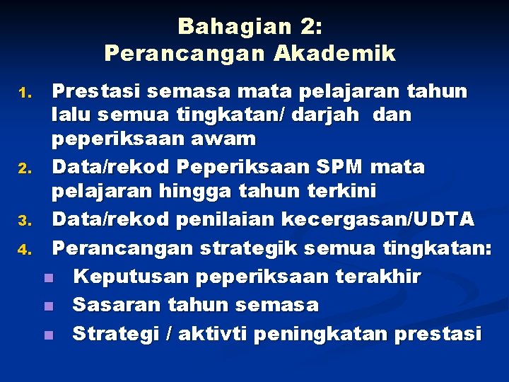 Bahagian 2: Perancangan Akademik 1. 2. 3. 4. Prestasi semasa mata pelajaran tahun lalu semua tingkatan/ darjah dan peperiksaan awam Data/rekod Peperiksaan SPM mata pelajaran hingga tahun terkini Data/rekod penilaian kecergasan/UDTA Perancangan strategik semua tingkatan: n Keputusan peperiksaan terakhir n Sasaran tahun semasa n Strategi / aktivti peningkatan prestasi