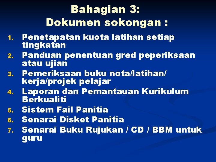 Bahagian 3: Dokumen sokongan : 1. 2. 3. 4. 5. 6. 7. Penetapatan kuota latihan setiap tingkatan Panduan penentuan gred peperiksaan atau ujian Pemeriksaan buku nota/latihan/ kerja/projek pelajar Laporan dan Pemantauan Kurikulum Berkualiti Sistem Fail Panitia Senarai Disket Panitia Senarai Buku Rujukan / CD / BBM untuk guru