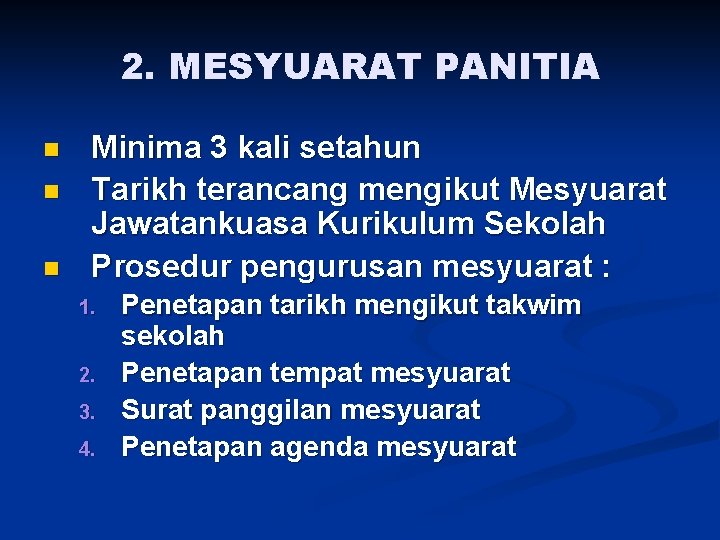 2. MESYUARAT PANITIA n n n Minima 3 kali setahun Tarikh terancang mengikut Mesyuarat Jawatankuasa Kurikulum Sekolah Prosedur pengurusan mesyuarat : 1. 2. 3. 4. Penetapan tarikh mengikut takwim sekolah Penetapan tempat mesyuarat Surat panggilan mesyuarat Penetapan agenda mesyuarat