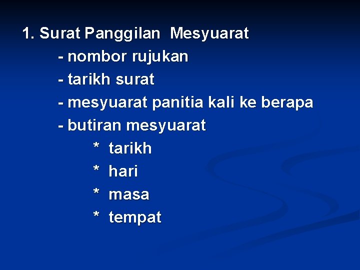 1. Surat Panggilan Mesyuarat - nombor rujukan - tarikh surat - mesyuarat panitia kali ke berapa - butiran mesyuarat * tarikh * hari * masa * tempat