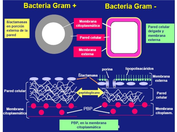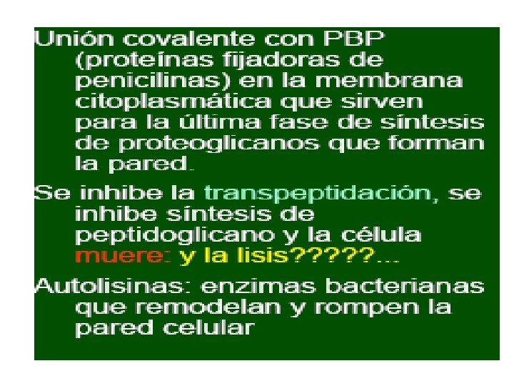 MECANISMO DE ACCIÓN • Las penicilinas, conjuntamente con las cefalosporinas, inhiben selectivamente diferentes pasos de la síntesis del péptidoglicán (mureína) • sustancia que le confiere la forma, rigidez y estabilidad a la membrana celular de casi todas las bacterias de importancia médica