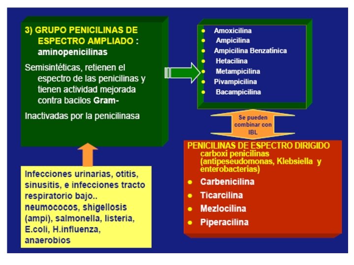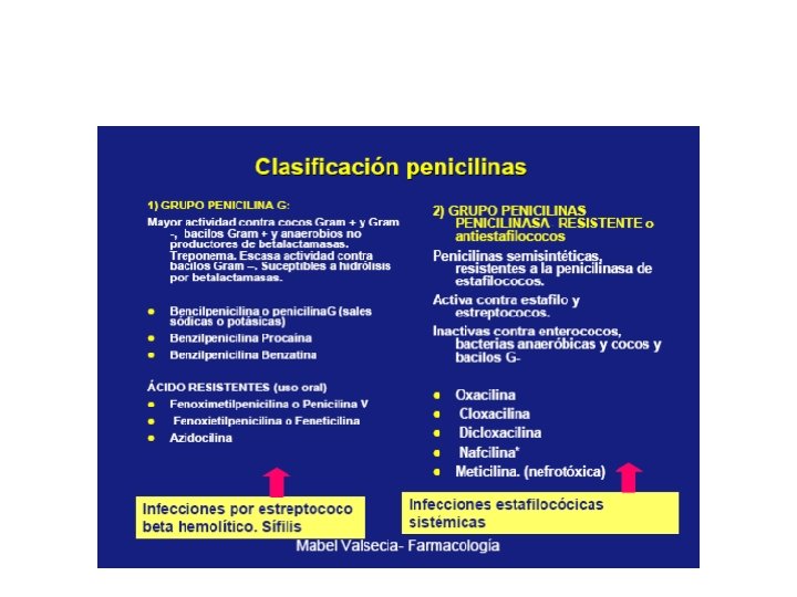 CLASIFICACIÓN POR GRUPOS • 1. Bencilpenicilina y sus formas parenterales de acción prolongada - Bencilpenicilina - Penicilina benetamina - Penicilina benzatínica - Penicilina clemizol - Penicilina procaínica 2. Penicilinas absorbibles oralmente, semejantes a la bencilpenicilina - Azidocillína - Fenetecilína - Fenoximetilpenicilina 3. Penicilinas resistentes a ßlactamasas staphylocócicas: 3. 1 Isoxazolilpenicilinas - Cloxacilína - Dicloxacilína - Oxacilína - Fluoroxacilína 3. 2 Meticilína 3. 3 Nafcilína - Temocilína • 4. Penicilinas de amplio espectro 4. 1 Ampicilína 4. 2 Ésteres del ampicilína - Bacampicilína - Lenampicilína 4. 3 Compuestos similares al ampicilína - Amoxicilína - Mecilina (amdinocilina) - Ciclacilína 5. Penicilinas antipseudomónicas 5. 1 Acilureidopenicilinas - Azlocilína - Mezlocilína - Piperacilína 5. 2 Carboxipenicilinas - Carbenicilína - Ticarcilína 6. Penicilinas resistentes a ßlactamasas (de enterobacterias) - Foramidocilína