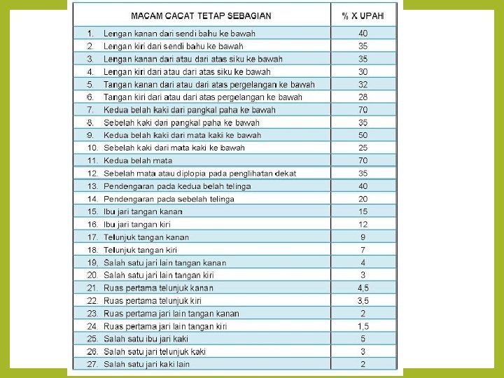 Beberapa organ • Bila cacat terjadi pada beberapa organ, penentuan tingkat cacat dilakukan dengan menjumlah semua tingkat cacat masing organ sampai jumlah maksimal yaitu 70% upah sesuai PP. no 14 /1993 • Keluhan nyeri gradasinya sulit diukur, melihatnya dari fungsi organ (fisik dan lab. ) dan syaraf pusat dan spinal.