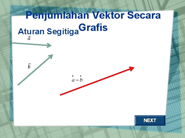 Penjumlahan Vektor Misalkan: dan Jika: a + b = c , maka vektor NEXT