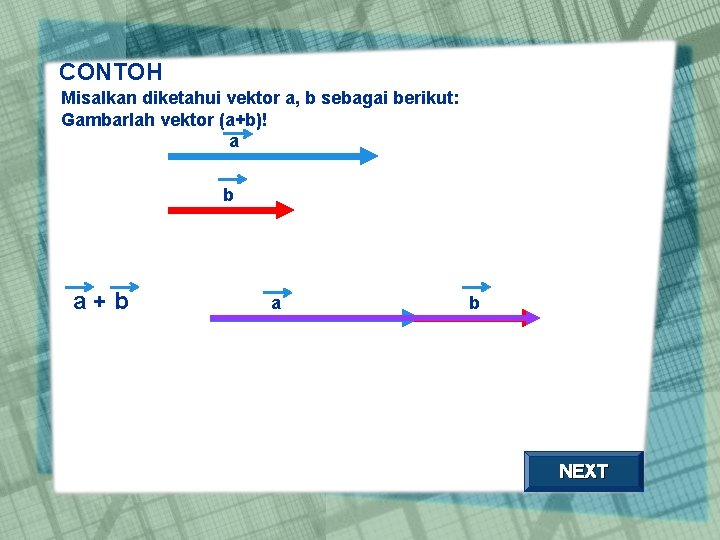 CONTOH Misalkan diketahui vektor a, b sebagai berikut: Gambarlah vektor (a+b)! a b a+b a b NEXT