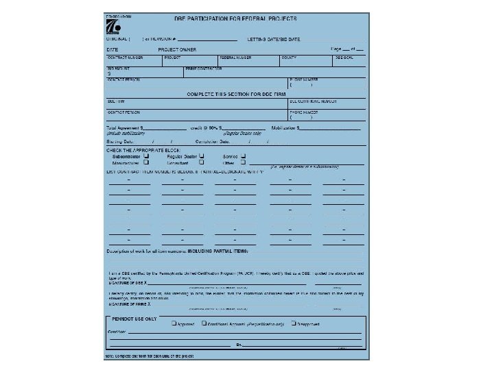 AGENDA January 20, 2017 • Federal Compliance with 49 CFR Part 26 for Penn. DOT and its recipients/subrecipients to be in compliance • Penn. DOT proposed solution • Recipient/Subrecipient feedback