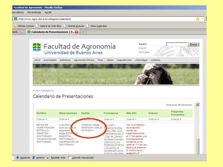 La investigación científico-técnica como carrera profesional ► ¿Cuál es la oferta de posgrados disponibles, dentro y fuera de la FAUBA? * amplísima: nacional e internacional * FAUBA: Escuela para Graduados (EPG) “Alberto Soriano” -- http: //epg. agro. uba. ar ► ¿Existen indicadores objetivos de la calidad de un posgrado? * CONEAU: acreditación y categorización http: //www. coneau. edu. ar (A, B, C…)