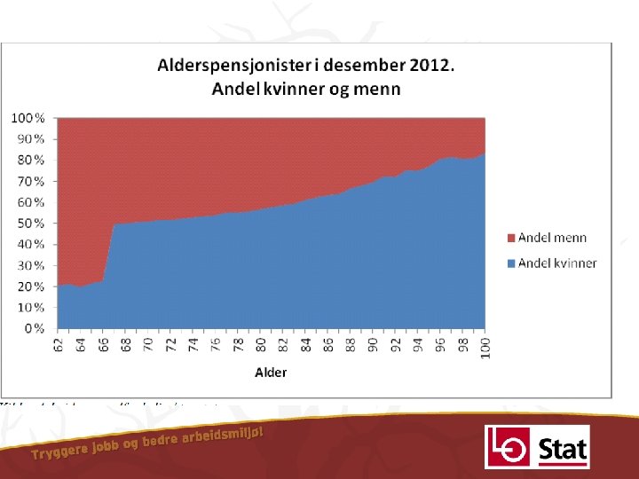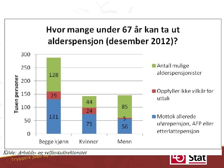 Evaluering så langt • Flere tar ut pensjon fra 62 år – flest menn, 79% • Fra 2010 til 2012 økte antall alderspensjonister med 96 000 • Andel med offentlig AFP, gammel privat AFP og uførepensjon har gått noe ned – Offentlig AFP ned 8 %