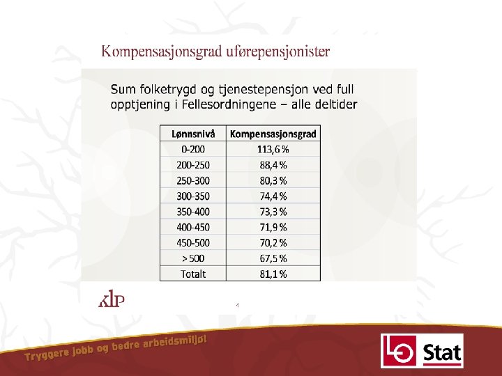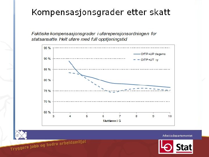 AD, mars 2012: ”Det overordnede fokuset i tilpassingen av offentlig tjenestepensjon til ny folketrygd, både for alderspensjon og uføre, bør være hva de totale kompensasjonsgradene skal bli, ikke hvilke samordningsfordeler regelverket gir i dag. ” ”For personer med full tjenestetid, full trygdetid, som alltid har arbeidet fulltid og som har hatt relativt jevn inntekt over livsløpet, gir samordnings regelverket relativt oversiktlige resultater. ” ”For personer uten fulle yrkes karrierer, som arbeider deltid, og med ujevn inntekt har dette notatet illustrert at samspillet mellom de ulike samordningsreglene kan gi relativt uforutsigbare og lite hensiktsmessige resultater. ” ”Det bør ikke være et mål for tilpassingen til ny folketrygd at alle disse samspilleffektene skal videreføres. ”