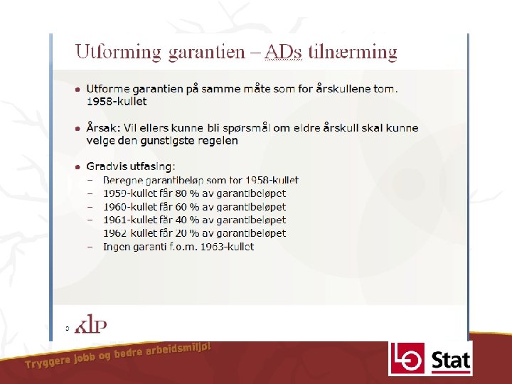 Banklov II og III • Banklov II – Foreslår system for nye tjenestepensjoner i privat sektor • Banklov III – Fase ut ytelsespensjonene i privat sektor • Siste årskull 1962 – 1963 – første årskull med 100% opptjening etter ny folketrygd 9