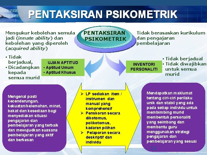 PENTAKSIRAN PSIKOMETRIK Mengukur kebolehan semula jadi (innate ability) dan kebolehan yang diperoleh (acquired ability) PENTAKSIRAN PSIKOMETRIK • Tidak berjadual, UJIAN APTITUD • Dicadangkan • Aptitud Umum • Aptitud Khusus kepada semua murid Mengenal pasti kecenderungan, kekuatan/kelemahan, minat, bakat dan kesediaan bagi menyediakan situasi pengajaran dan pembelajaran yang terbaik dan mewujudkan suasana pembelajaran yang aktif dan berkesan Tidak berasaskan kurikulum dan pengajaran pembelajaran INVENTORI PERSONALITI Ø LP sediakan item / instrumen dan manual yang komprehensif Ø Penskoran secara dikotomus, polikotomus, kadaran pilihan Ø Pelaporan secara deskriptif dan individu • Tidak berjadual • Tidak diwajibkan untuk semua murid Mendapatkan maklumat tentang ciri-ciri perilaku unik dan stabil yang ada pada setiap individu untuk membimbing murid membentuk personaliti yang seimbang dan membantu guru menggunakan strategi pengajaran dan pembelajaran yang sesuai 11 COMPANY LOGO