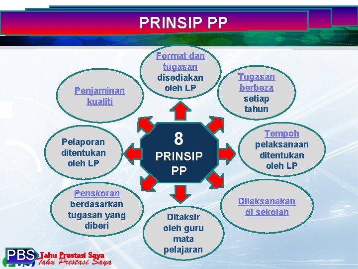 PRINSIP PP Penjaminan kualiti Pelaporan ditentukan oleh LP Penskoran berdasarkan tugasan yang diberi PBS Tahu Prestasi Saya Format dan tugasan disediakan oleh LP 8 PRINSIP PP Ditaksir oleh guru mata pelajaran Tugasan berbeza setiap tahun Tempoh pelaksanaan ditentukan oleh LP Dilaksanakan di sekolah