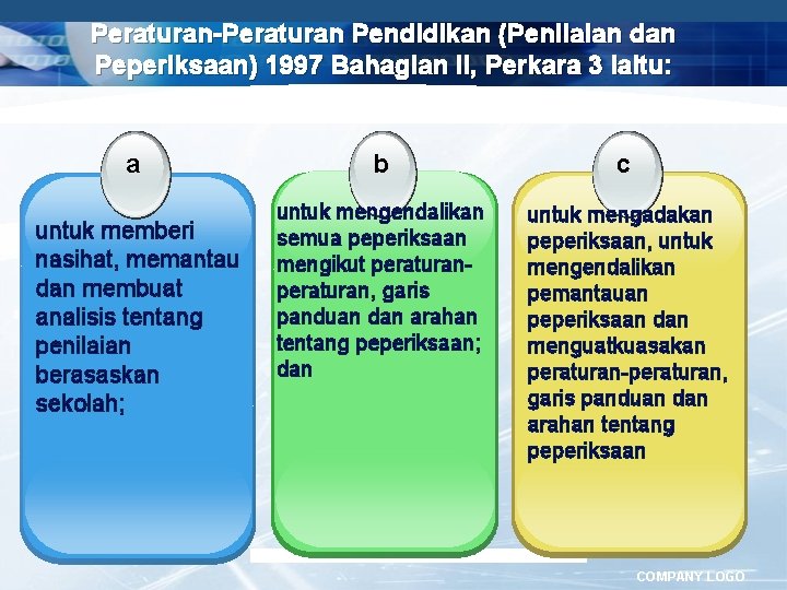Peraturan-Peraturan Pendidikan (Penilaian dan Peperiksaan) 1997 Bahagian II, Perkara 3 iaitu: a untuk memberi nasihat, memantau dan membuat analisis tentang penilaian berasaskan sekolah; b c untuk mengendalikan semua peperiksaan mengikut peraturan, garis panduan dan arahan tentang peperiksaan; dan untuk mengadakan peperiksaan, untuk mengendalikan pemantauan peperiksaan dan menguatkuasakan peraturan-peraturan, garis panduan dan arahan tentang peperiksaan COMPANY LOGO
