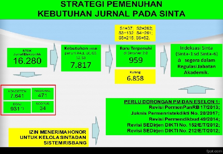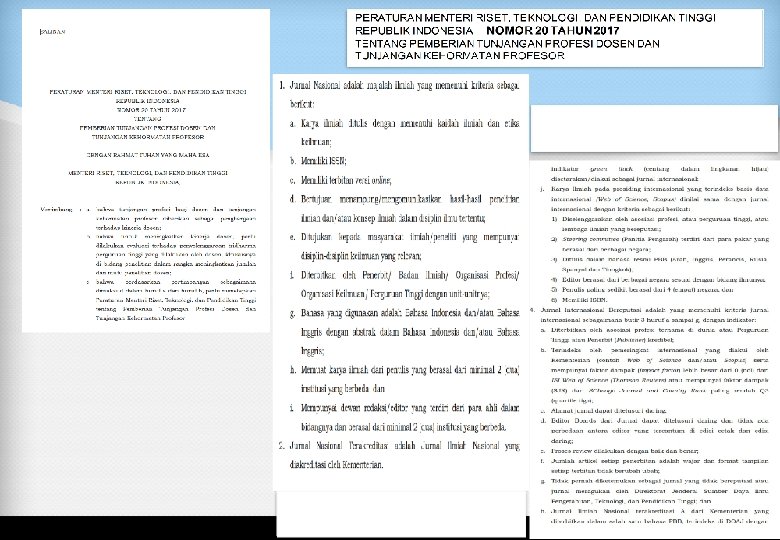 Peraturan Menteri Pendayagunaan Aparatur Negara dan Reformasi Birokrasi Nomor 17 Tahun 2013 tentang Jabatan Fungsional Dosen dan Angka Kreditnya, dan Peraturan Menteri Pendidikan dan Kebudayaan Republik Indonesia Nomor 78 Tahun 2013 tentang Pemberian Tunjangan Profesi dan Tunjangan Kehormatan bagi Dosen yang Menduduki Jabatan Akademik Profesor telah memberikan persyaratan kenaikan jenjang jabatan dalam fungsional dosen antara lain: 1. 2. 3. Kenaikan jabatan dari Asisten Ahli ke Lektor, sekurang-kurangnya telah 4 tahun dari jabatan Asisten Ahli, dimungkinkan kurang dari 4 tahun bagi dosen yg berprestasi apabila mempunyai publikasi pada jurnal nasional terakreditasi sebagai penulis utama; Kenaikan jabatan dari Lektor ke Lektor Kepala sekurang-kurangnya telah 2 tahun dalam jabatan lektor, berpendidikan Magister (S 2), harus memiliki karya ilmiah yang dimuat di jurnal internasional bereputasi atau berpendidikan (S 2) harus memiliki karya ilmiah yang dimuat di jurnal nasional terakreditasi; Kenaikan Jabatan dari Lektor Kepala ke Guru Besar, sekurang-kurangnya telah 2 tahun dalam jabatan Lektor Kepala, harus memiliki publikasi karya ilmiah yang dipublikasikan pada jurnal internasional bereputasi serta telah memiliki pengalaman kerja sebagai dosen minimal 10 (sepuluh) tahun.