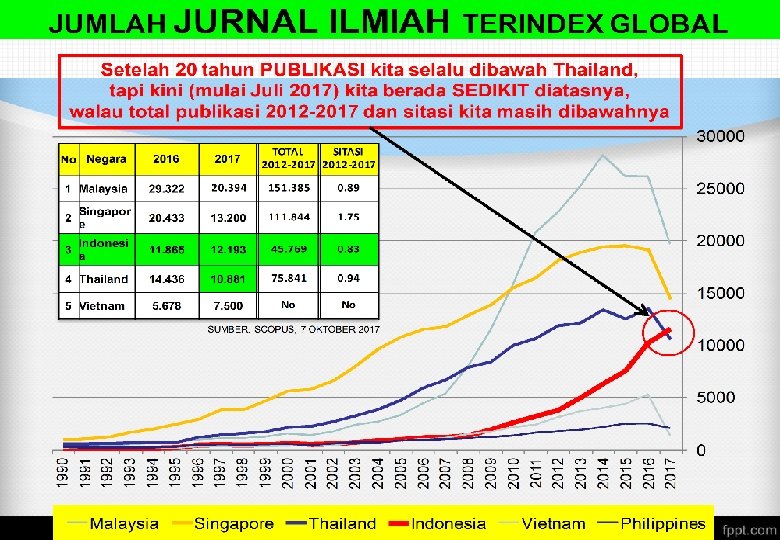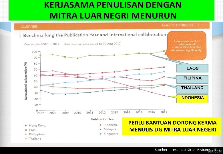 PUBLIKASI INTERNASIONAL Perlunya Publikasi Internasional Penyebarluasan hasil penelitian pada komunitas yang lebih luas, tidak hanya lokal Menunjukkan reputasi kualitas penelitian Menunjukkan daya saing bangsa khususnya bidang riset dan pendidikan Kebutuhan seorang dosen, utamanya yang mau ke guru besar Alat tukar untuk mendapatkan beasiswa internasional Mendapatkan penghargaan atau pengakuan Untuk Kenaikan Pangkat (UKP) Mendapatkan kredit point Berperan untuk menjalin networking dan funding internasional Mendapatkan reward (Uang).