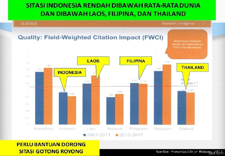 POSISI RISTEK DAN IPTEK NASIONAL Perbandingan Jumlah Paten Indonesia dengan beberapa negara ASEAN di USPTO 2005 -2014 Sumber: Scimago, 2016 Publikasi Internasional Indonesia dibandingkan dengan beberapa negara ASEAN, 1996 -2014 Sumber: Scimago, 2016 INDIKATOR IPTEK Publikasi Internasional: Indonesia < Thailand < Singapore < Malaysia Jumlah Paten USPTO: Indonesia < Thailand < Malaysia < Singapore Peringkat Paten Philipina < Vietnam < Indonesia < Thailand < Singapura < Malaysia < Korea Peringkat Paten Terdaftar di Beberapa Negara ASIA, 2014
