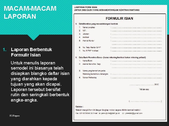 MACAM-MACAM LAPORAN 1. Laporan Berbentuk Formulir Isian Untuk menulis laporan semodel ini biasanya telah disiapkan blangko daftar isian yang diarahkan kepada tujuan yang akan dicapai. Laporan tersebut bersifat rutin dan seringkali berbentuk angka-angka. BI/Ragam 10/19/2021 11