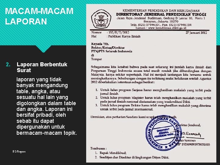 MACAM-MACAM LAPORAN 2. Laporan Berbentuk Surat laporan yang tidak banyak mengandung table, angka, atau sesuatu hal lain yang digolongkan dalam table dan angka. Laporan ini bersifat pribadi, oleh sebab itu dapat dipergunakan untuk bermacam-macam topik. BI/Ragam 10/19/2021 12