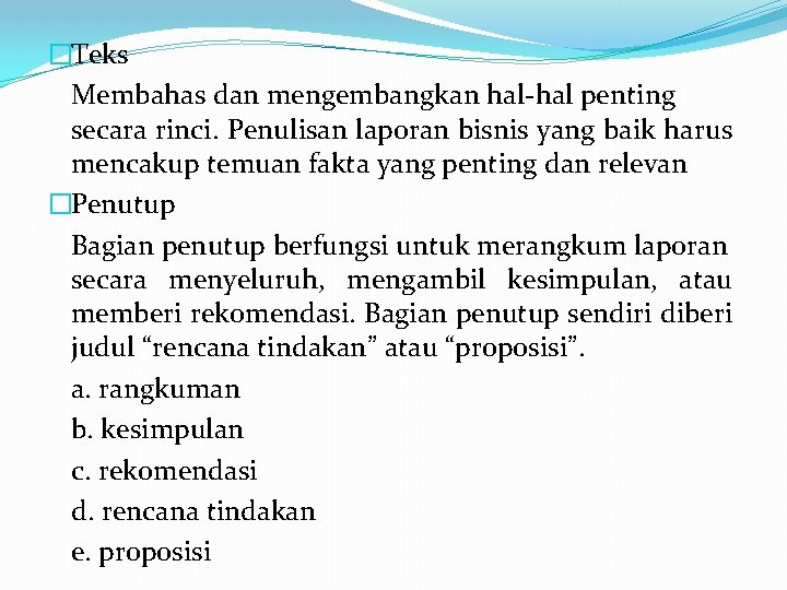 �Teks Membahas dan mengembangkan hal-hal penting secara rinci. Penulisan laporan bisnis yang baik harus mencakup temuan fakta yang penting dan relevan �Penutup Bagian penutup berfungsi untuk merangkum laporan secara menyeluruh, mengambil kesimpulan, atau memberi rekomendasi. Bagian penutup sendiri diberi judul “rencana tindakan” atau “proposisi”. a. rangkuman b. kesimpulan c. rekomendasi d. rencana tindakan e. proposisi
