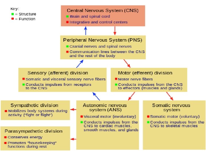 Struktur system syaraf • sistem saraf pusat (SSP) terdiri: otak & sumsum tulang belakang. • sistem saraf tepi (SST) terdiri: saraf panjang yang menghubungkan SSP ke setiap bagian dari tubuh. SST meliputi: • saraf motorik, memediasi pergerakan volunter (disadari), • sistem saraf otonom meliputi: – sistem saraf simpatis & saraf parasimpatis yang berfungsi regulasi (pengaturan) involunter (tanpa disadari) – sistem saraf enterik (pencernaan), sebuah bagian semibebas dari sistem saraf , fungsinya untuk kontrol sistem pencernaan.
