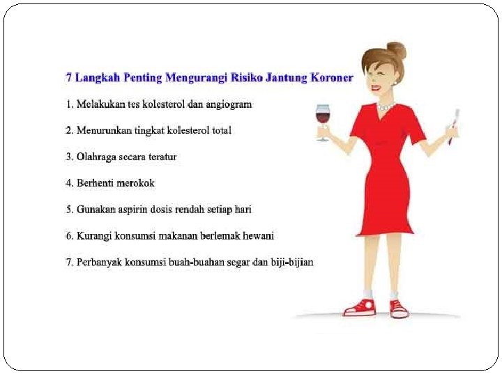 �Faktor risiko yang dapat dimodifikasi : 1. Hipertensi 2. Diabetes Melitus 3. Dislipidemia 4. Kurang aktivitas fisik 5. Diet tidak sehat 6. Stres 7. Perokok pasif