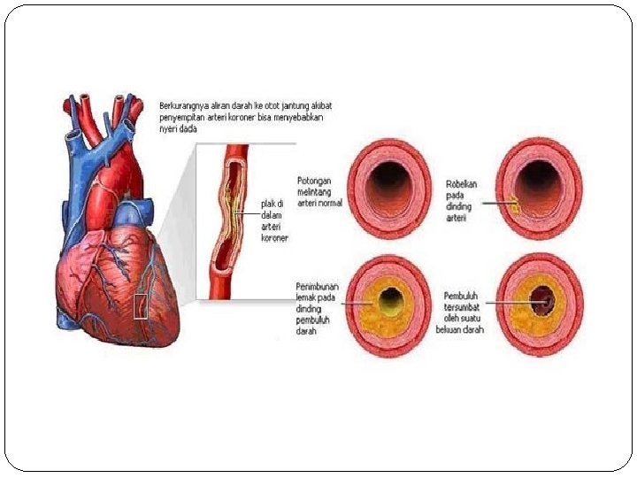 Patofisiologi �Kolesterol yang menimbun di dinding bagian dalam pembuluh darah, dapat mengakibatkan pembuluh darah mengalami penyempitan dan aliran darahpun menjadi tersumbat. Akibatnya, fungsi jantung terganggu karena harus bekerja lebih keras untuk memompa aliran darah. Seiring perjalanan waktu, arteri-arteri koroner makin sempit dan mengeras. Inilah yang disebut aterosklerosis.
