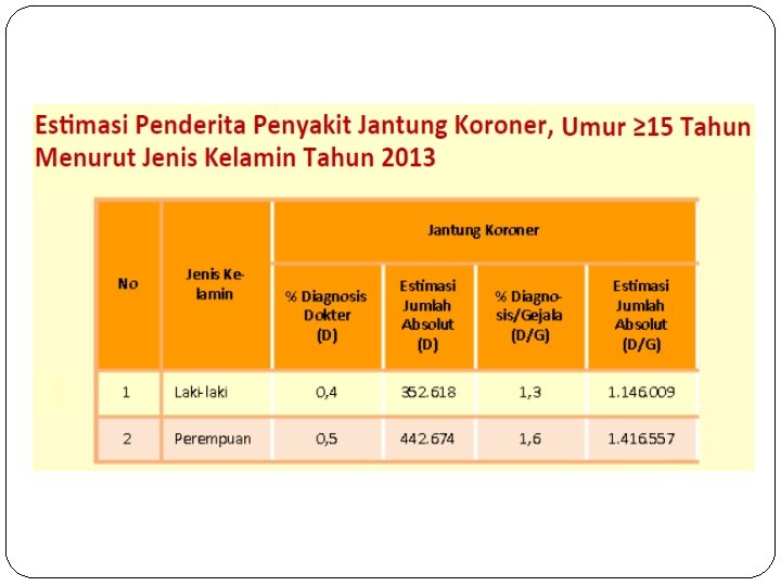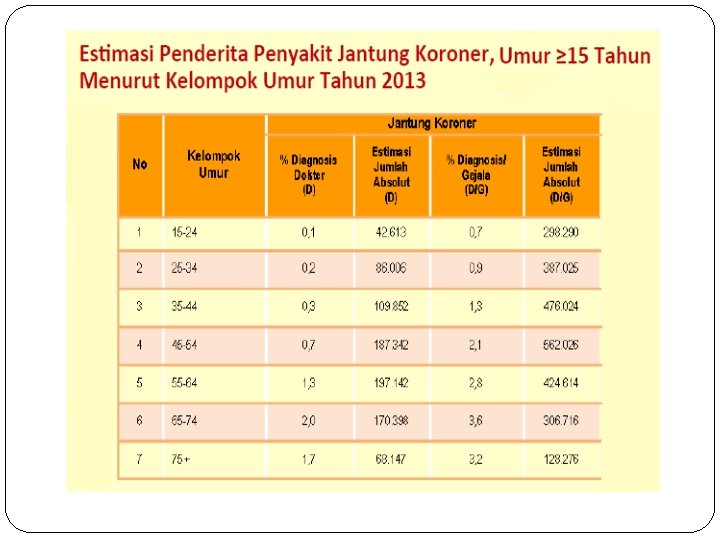 Perkembangan Penyakit � Penyakit jantung koroner (PJK) terjadi ketika pasokan darah ke otot-otot dan jaringan jantung tersumbat oleh penumpukan bahan lemak dalam dinding arteri koroner. Penyakit jantung koroner (PJK) ini dapat dikatakan sebagai pembunuh nomor satu. Di seluruh dunia, PJK menyebabkan kurang lebih 74. 000 kematian setiap tahun. Artinya, rata-rata 200 orang setiap hari. � Untuk Indonesia, saat ini penyakit jantung koroner menempati posisi pertama sebagai penyebab kematian. Tingginya angka kematian di Indonesia akibat penyakit jantung koroner (PJK) mencapai 26% dari seluruh jumlah kematian akibat penyakit. Berdasarkan hasil Survei Kesehatan Rumah Tangga Nasional (SKRTN), dalam 10 tahun terakhir angka tersebut cenderung mengalami peningkatan.