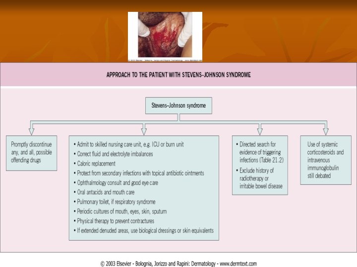 Imunologi Pada beberapa kasus terdapat deposit Ig. M dan C 3 pd pemb darah dermal superfisial dan pd pemb darah yg mengalami kerusakan. Pd sebag besar kasus terdapat kompleks imun yg mengandung Ig G, Ig. M, Ig. A secara tersendiri atau dalam kombinasi. Diagnosa banding Nekrolisis epidermal toksik [NET] sangat mirip dg Steven Johnson. Pada NET terdapat epidermolisis yg menyeluruh dan keadaan umum lebih buruk.