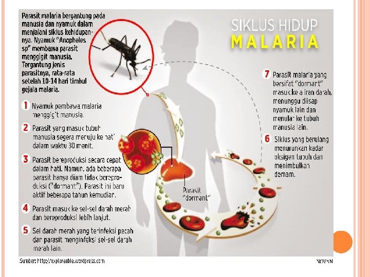 Malaria adalah penyakit infeksi yang disebabkan oleh protozoa parasit yang merupakan golongan plasmodium yang hidup dan berkembang biak dalam sel darah merah manusia Potofisiologi Gigitan nyamuk Anpeles, sporozoit masuk aliran darah ½-1 jam menuju untuk berkembang biak.