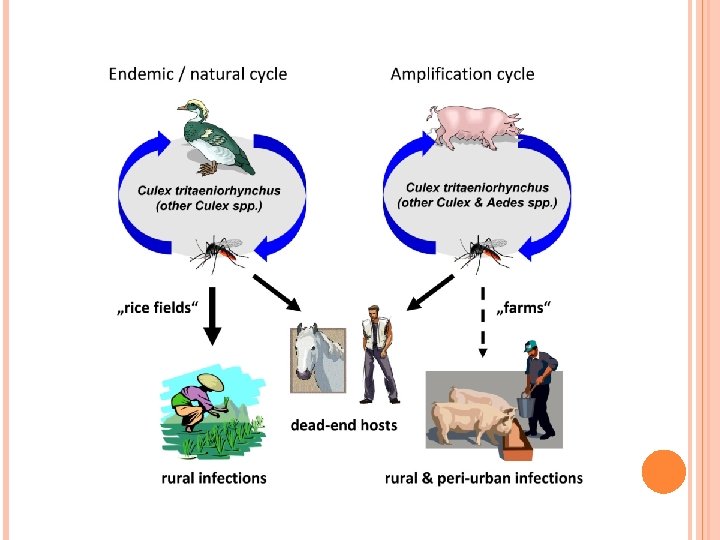 PENULARAN Penyebaran penyakit JE tidak dapat ditularkan melalui kontak Iangsung, tetapi harus melalui vektor, yaitu melalui gigitan nyamuk yang telah mengandung virus JE Masa inkubasi pada nyamuk penular antara 9 -12 hari dan nyamuk yang terinfeksi virus JE, selama hidupnya akan menjadi infektif yang dapat menularkan ke hewan dan manusia