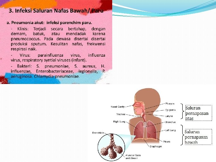 Inilah 10 penyakit paling berbahaya pada anak 1. Infeksi saluran napas bawah �Penyakit mematikan di dunia modern. �Infeksi saluran pernapasan bawah termasuk pneumonia dan bronkitis. �Sulit untuk percaya, tetapi faktanya infeksi saluran pernapasan bawah jauh melebihi jumlah korban tewas di seluruh dunia dibanding AIDS dan malaria. Angka kematian : lebih dari 4 juta jiwa setiap tahun. �Pem lab : darah lengkap, dahak