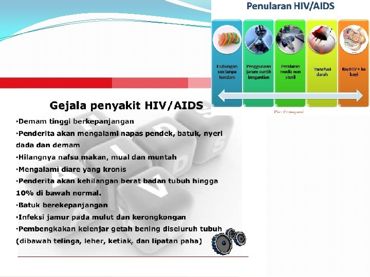 2. HIV / AIDS �Angka kejadian: sekitar 39, 4 juta orang yang hidup dengan AIDS. �HIV atau human immunodeficiency virus tidak lebih dari pengikisan terhadap sistem kekebalan tubuh seseorang, ketika pasien rentan terhadap infeksi lain. �Adapun AIDS atau acquired immunodeficiency syndrome biasanya mengikutinya dalam waktu 8 sampai 15 tahun, kecuali pasien menerima pengobatan. Sering kali, pasien meninggal karena TB atau pneumonia setelah infeksi AIDS. �Angka kematian : 3 juta jiwa per tahun. �Pem lab : tes HIV