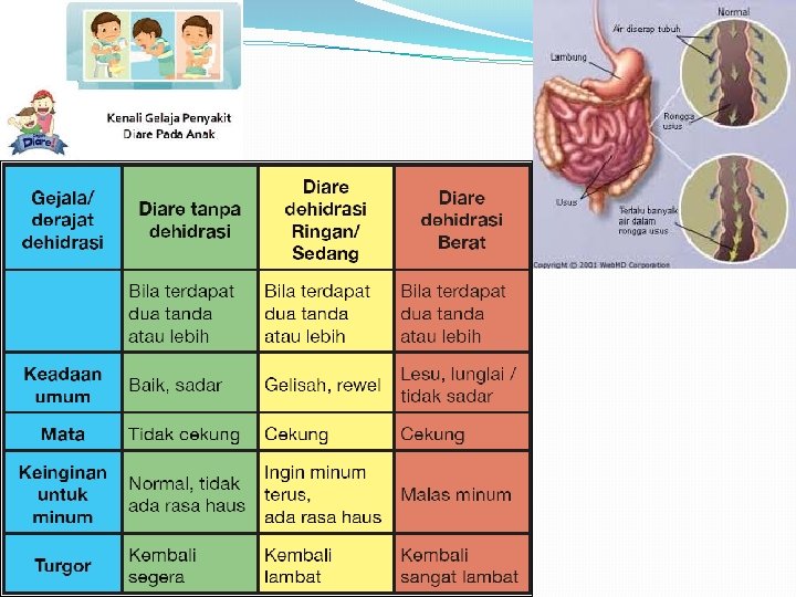 4. Diare �Angka rata-rata infeksi: 4 miliar kasus didiagnosis setiap tahunnya. �Diare pada anak sering disebabkan oleh rotavirus. Penyebab diare lainnya adalah kolera, disentri, dan sejumlah infeksi bakteri lainnya, seperti cacing mikroskopis. �Diare mudah disembuhkan jika diobati secara dini. Kebanyakan kematian akibat diare, terutama pada anak-anak, berhubungan dehidrasi. �Angka kematian : sekitar 2, 2 juta jiwa setiap tahun. �Pem lab : FL