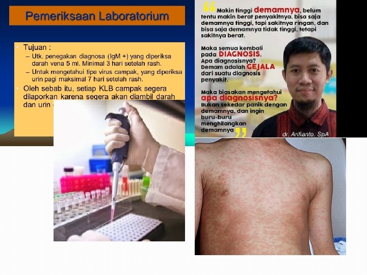 6. Campak �Angka kejadian: lebih dari 30 juta orang, kebanyakan anak -anak, terinfeksi setiap tahun. �Campak dapat dengan mudah disembuhkan, tetapi mematikan jika tidak ditangani. �Penyakit ini terjadi terutama pada anak-anak, dan terutama di negara-negara berkembang seperti Afrika dan beberapa di Asia Tenggara. Akan tetapi, virus campak dapat menginfeksi bahkan terhadap orang dewasa. �Campak dapat menyebabkan kerusakan otak, kebutaan, dan anak-anak rentan terhadap diare dan pneumonia. �Angka kematian : 1. 400 orang diperkirakan meninggal akibat campak setiap hari. �Pem lab : campak, darah lengkap