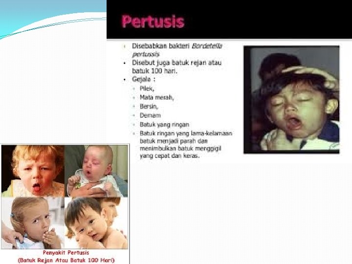 7. Batuk rejan �Angka kejadian: 20 sampai 40 juta kasus terdiagnosis setiap tahunnya. �Batuk rejan, atau pertusis, adalah penyakit yang sangat mematikan. Hal ini sangat menular dan, sekali seseorang terinfeksi, maka penyakit ini dapat menyebabkan sejumlah penyakit pernapasan akut pada seseorang. �Batuk rejan dapat diobati dengan antibiotik. Namun, vaksin masih menjadi cara untuk mendapat kekebalan yang optimal. �Angka kematian : 200. 000 sampai 300. 000 jiwa setiap tahun. �Pem lab : Darah lengkap, usap hidung/tenggorok