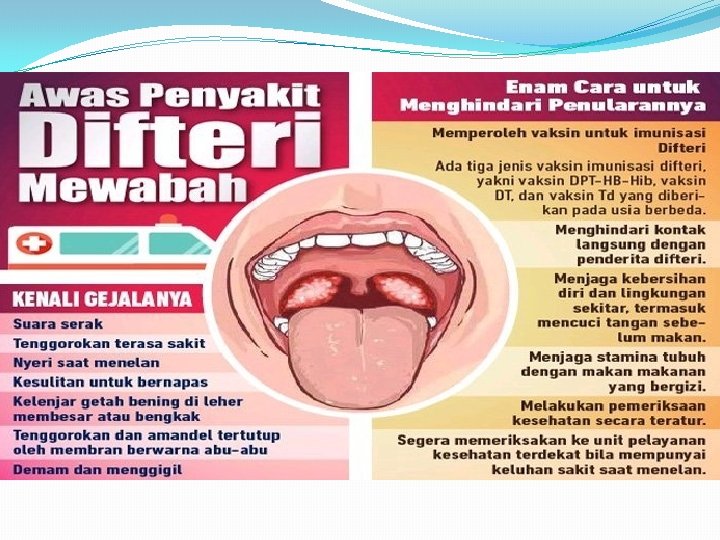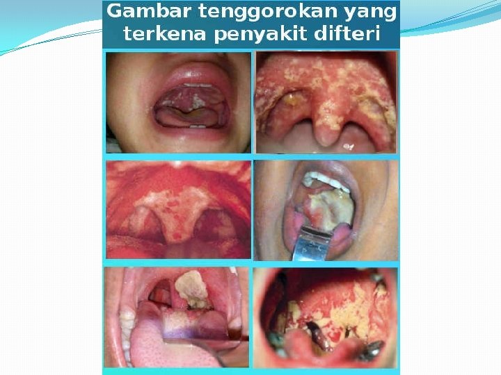 10. Difteri �Termasuk berbahaya dan dapat mengancam jiwa anak dalam cepat. �Tanda dan gejala hanya diawali demam dan sakit tenggorokan serta timbulnya bercak putih di tenggorokan. �Bila tidak diobati dengan cepat, maka hal ini dapat segera mengancam jiwa karena dapat membuntukan saluran pernapasan, jantung, sehingga dapat dengan cepat mengancam jiwa karena komplikasi tersebut. �Pem lab : darah lengkap, usap tenggorok, usap hidung