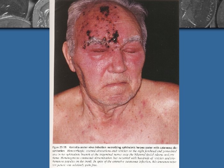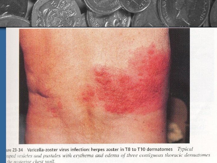HERPES ZOSTER Penyakit yang disebabkan oleh infeksi virus varisela-zoster yang menyerang kulit dan mukosa Epidemiologi reaktivasi vius yang terjadi setelah infeksi primer kadang-kadang varisela berlangsung subklinis aerogen Patofisiologi Ganglion posterior saraf tepi & kranialis Lokasi : setingkat daerah persarafan ganglion tersebut Kadang-kadang : gangguan motorik
